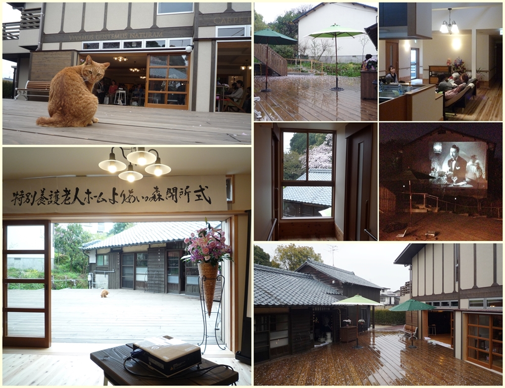 隣の古民家とをつなぐデッキもできあがり、二つの建物に一体感が生まれています。また外壁には、老いを前向きにとらえたラテン語のステキな言葉を彫刻。夜には、隣家の外壁を利用して映写会も楽しめるデッキ。このデッキがどのように使われるのか、すでにいろいろ計画があるようです。地域の人、家族とつながりのある暮らしができる特養、本当に楽しみです。 (Tsuki)