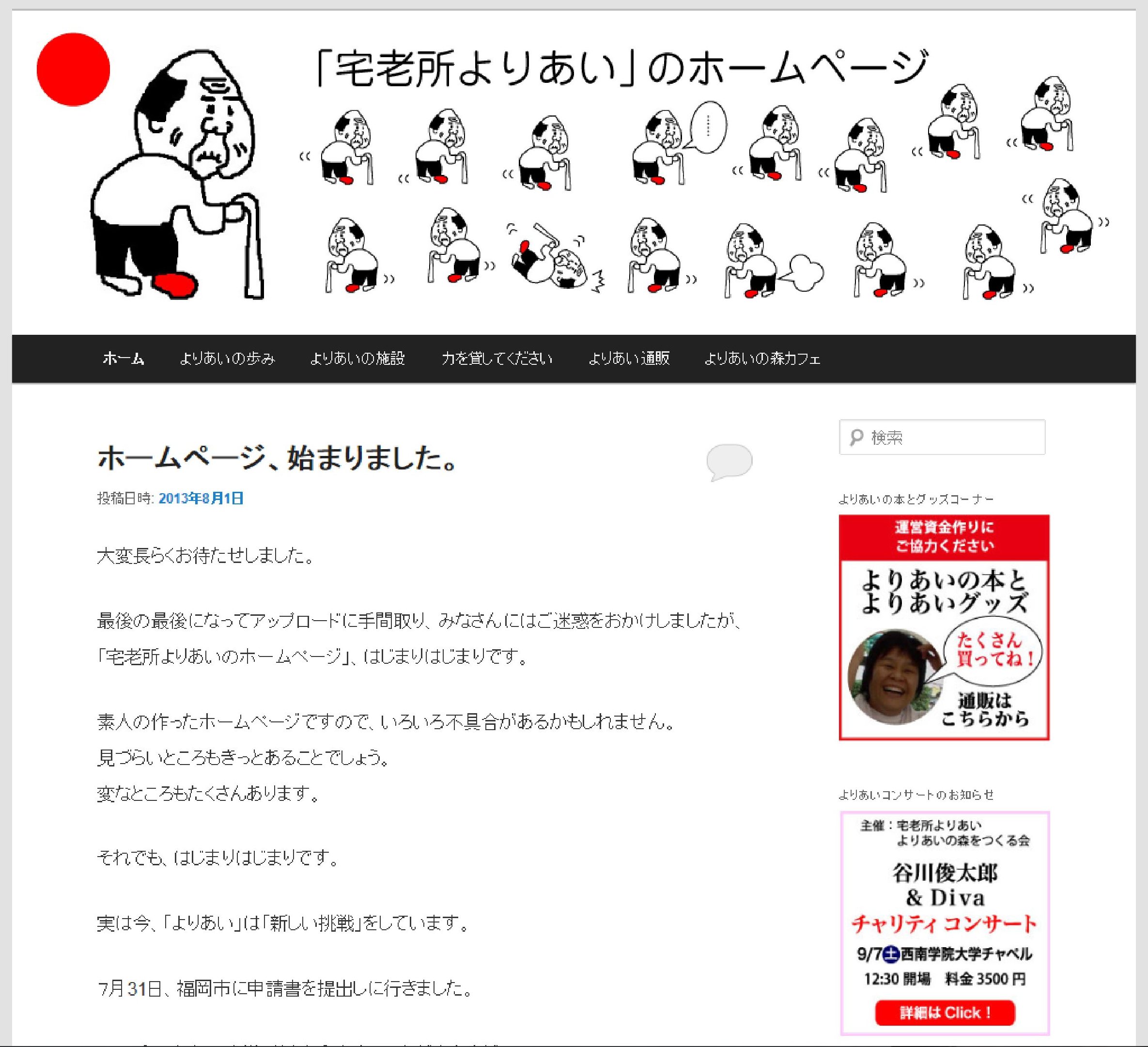 特別養護老人ホーム建設に向けての活動も活発な「宅老所よりあい」と「よりあいの森」。いま、どんなことに取り組んでいるのか。そもそも、「宅老所よりあい」「よりあいの森カフェ」って何をやっているんだろう。そのようなことも知ることができる「宅老所よりあい」のホームページができました。愛嬌のあるおじいちゃんが目印です。