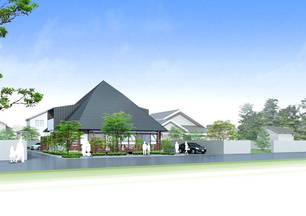 来春の開所にむけ、とんがり屋根を特徴にもつ、木造2階建ての認知症対応型のデイサービスセンター工事が始まります。 1階が定員12名の地域の人が集うデイサービススペース、2階がスタッフの事務室、会議室になります。松林が近くにある、住宅地。